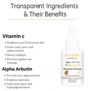 The ZAMISH Glow+ De-Tan Vitamin C Serum is a lightweight, fast-absorbing formula designed to brighten skin, reduce tan, and improve uneven skin tone. Powered with 12% Vitamin C and 2% Alpha Arbutin, this advanced serum helps fade dark spots, pigmentation, and dullness while boosting skin radiance.
