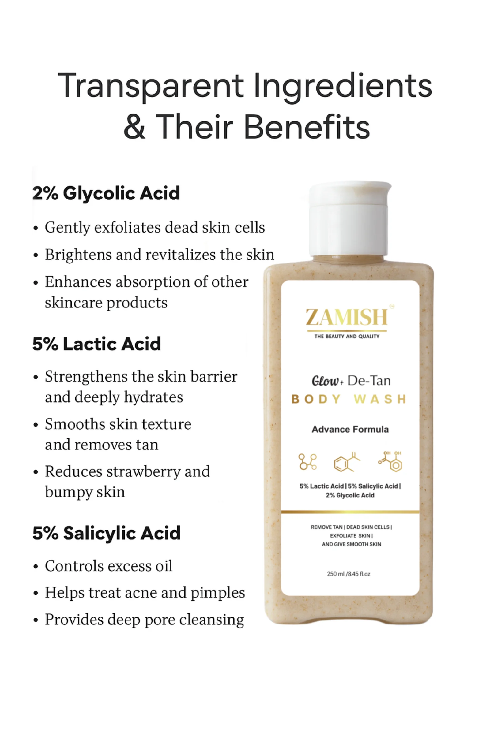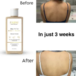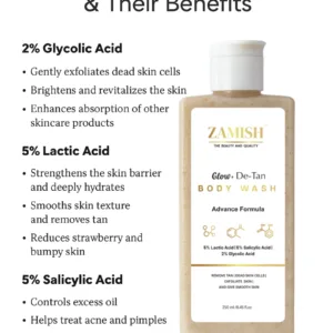 Reveal smoother, brighter-looking skin with ZAMISH Glow + De-Tan Body Wash, an advanced exfoliating cleanser designed to gently remove tan, dead skin cells, and impurities. Powered with a potent blend of Lactic Acid, Salicylic Acid, and Glycolic Acid, this body wash helps exfoliate the skin, improve texture, and promote a healthy glow with regular use.