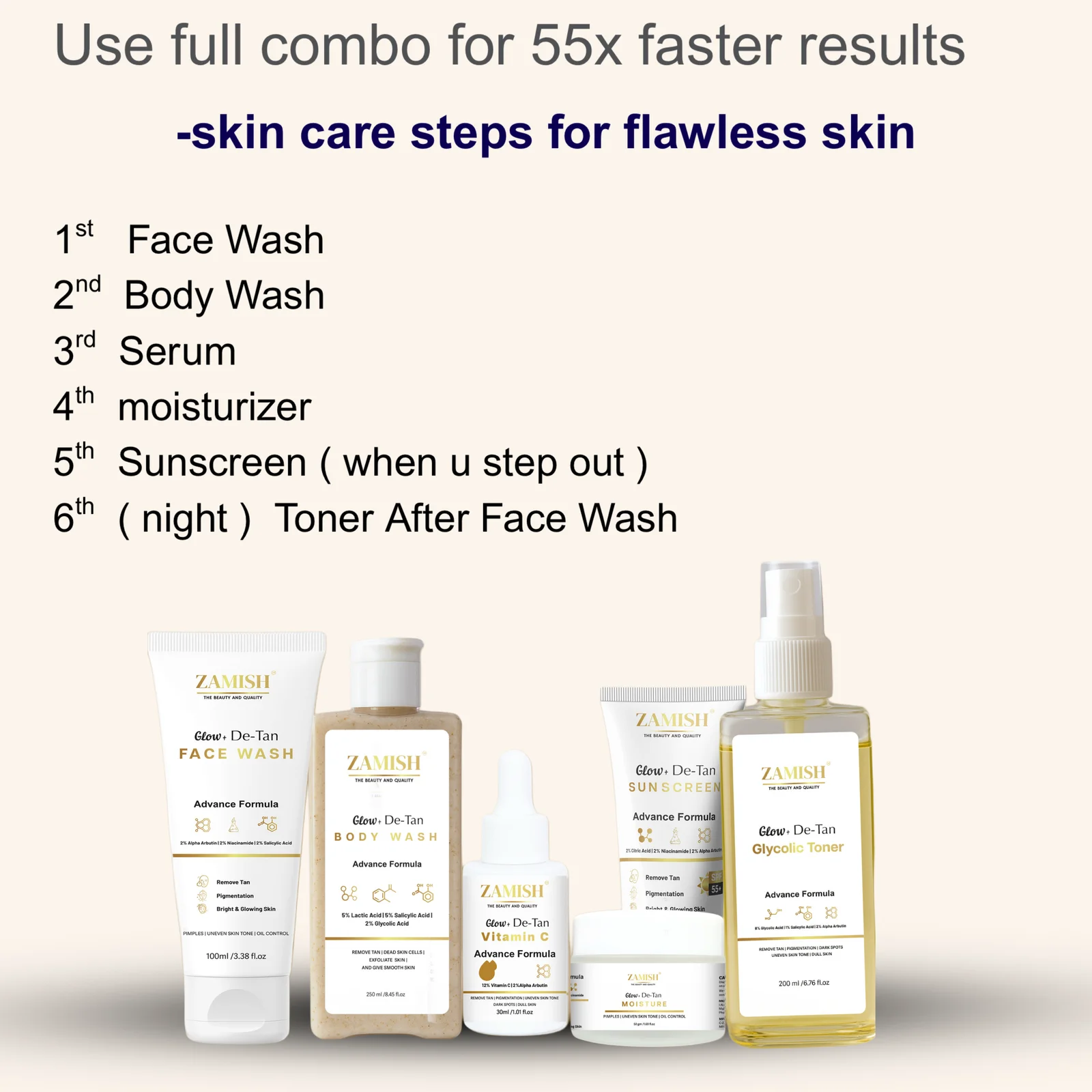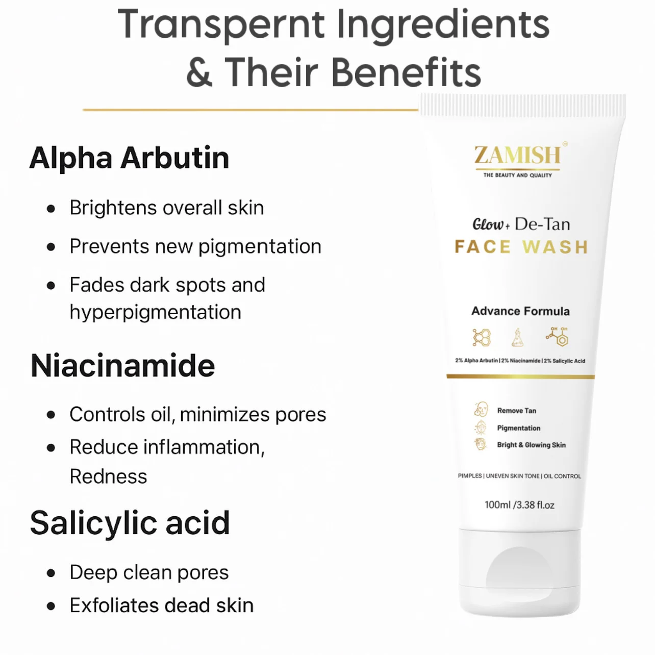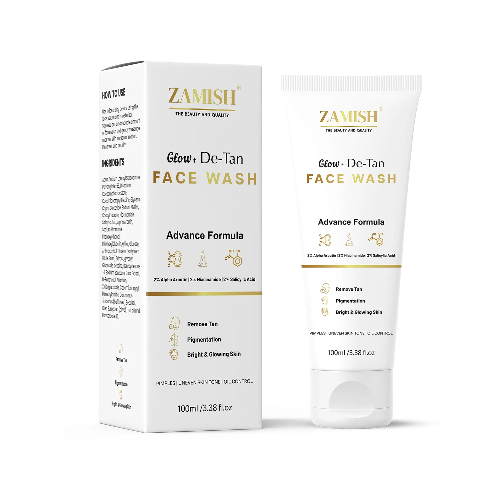 ZAMISH Glow + De-Tan Face Wash is an advanced daily cleanser formulated to gently yet effectively remove dirt, excess oil, and tan while enhancing skin brightness. Enriched with 2% Alpha Arbutin, 2% Niacinamide, and 2% Salicylic Acid, this face wash helps reduce pigmentation, control acne, and improve uneven skin tone.